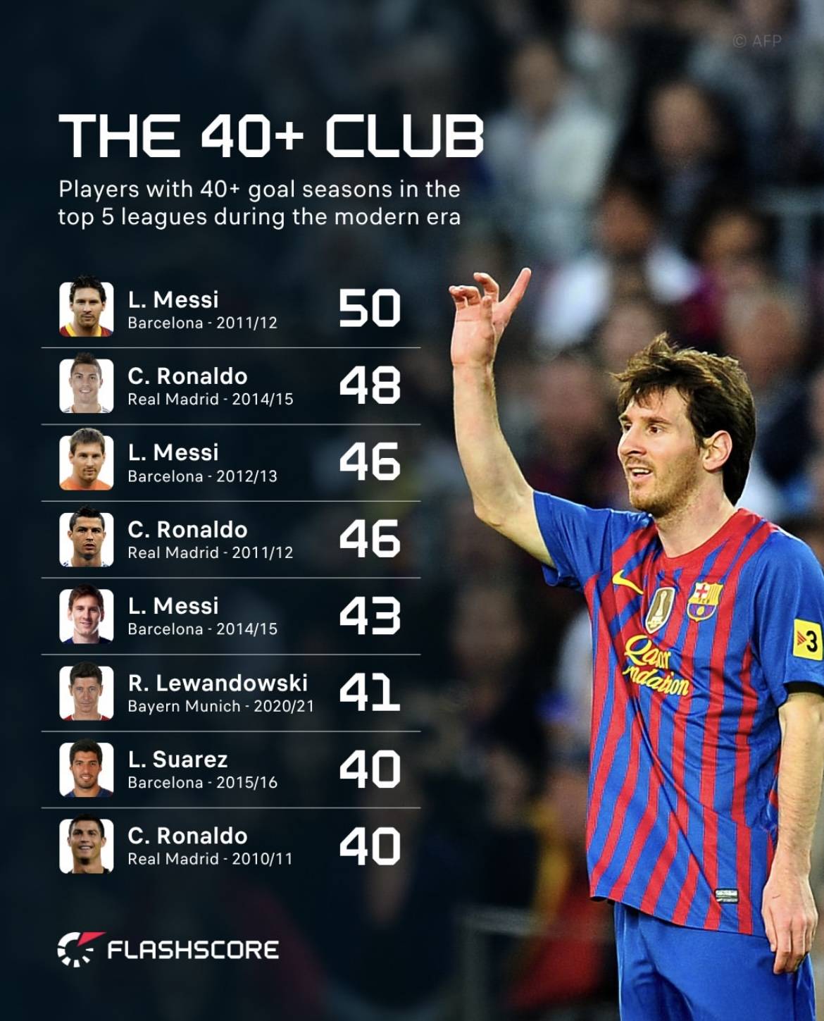 1. 梅西 Lionel Messi (巴塞罗那,2011/12赛季):50个进球